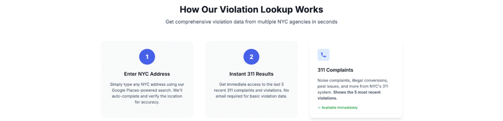 ViolationWatch Lookup provides the initial unified view at no cost. You enter an address once and receive a consolidated snapshot of 311 issues, HPD violations, DOB records, FDNY enforcement actions, and DEP notices. This becomes the starting point for deciding which matters require attention first.