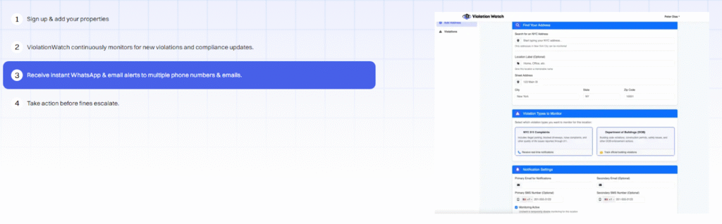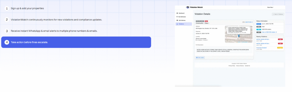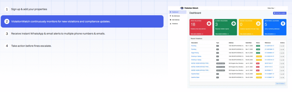 You start by signing up and adding your properties to the monitoring system. The platform pulls existing violation history and creates a baseline compliance profile for each address. This initial setup takes minutes but establishes comprehensive coverage across your entire portfolio, keeping every local law requirement front and center.