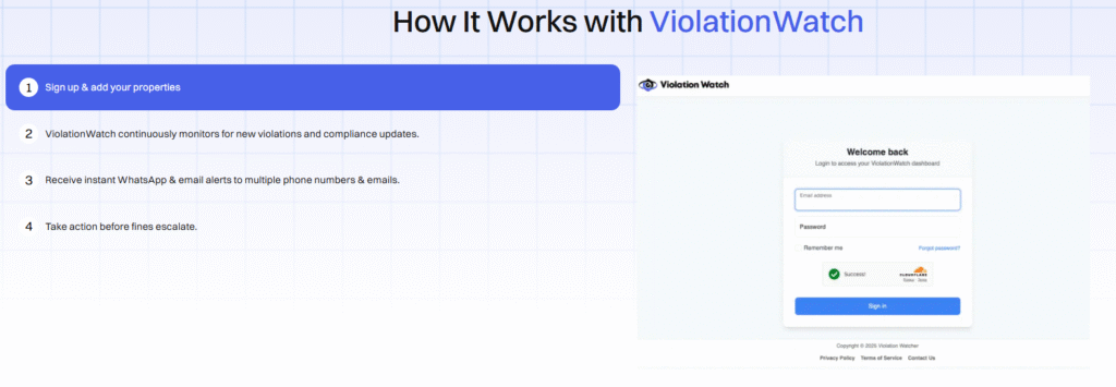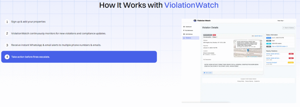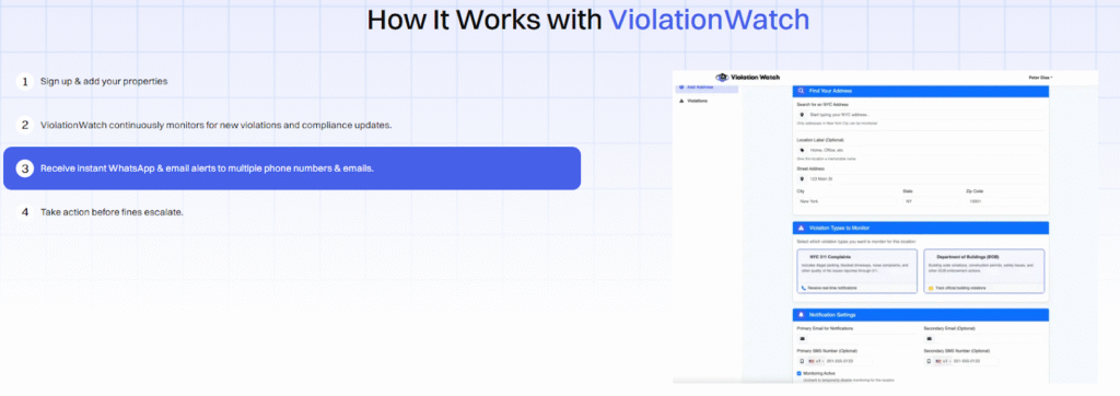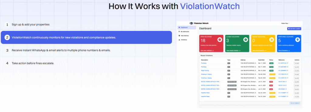 - Step 3: Instant alerts arrive: New violation? You get a WhatsApp message and an email immediately. Upcoming hearing? Notification sent. Status change on an existing violation? You’ll know before the city updates its public records.
