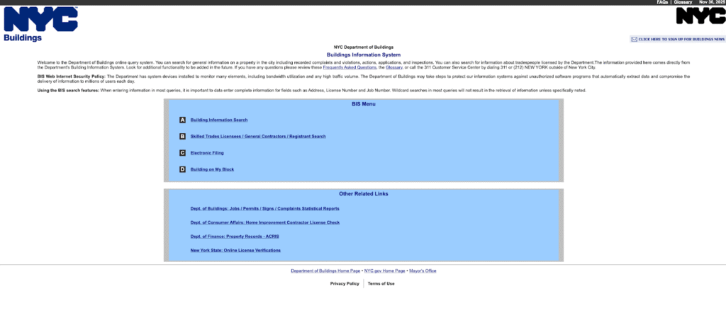 BIS operates as NYC’s comprehensive building database, covering permits, certificates of occupancy, construction applications, and yes, violations from multiple agencies, including HPD, DOB, and ECB.