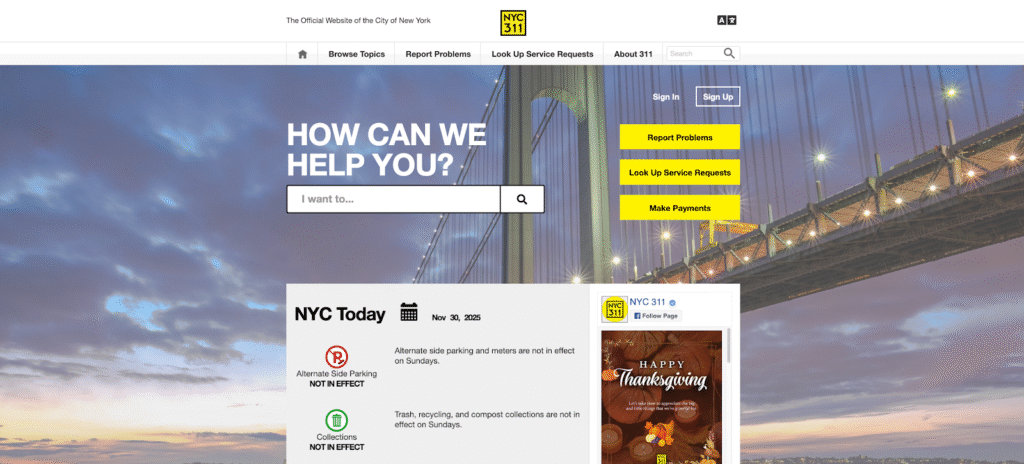 The 311 portal handles complaint submissions and service request tracking across all city agencies. Property managers use it to file complaints, track resolution progress, and monitor tenant-initiated service requests that might trigger HPD inspections.