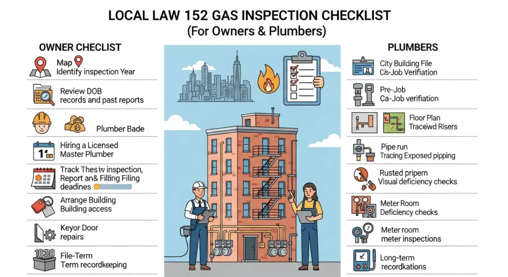 In this guide, we walk through a practical Local Law 152 gas inspection checklist from both sides: what owners must do, and how plumbers should structure the inspection so it passes DOB scrutiny and keeps occupants safe. We’ll cover deadlines, forms (GPS1 and GPS2), common DOB violations, and real‑world tips to avoid last‑minute panic.