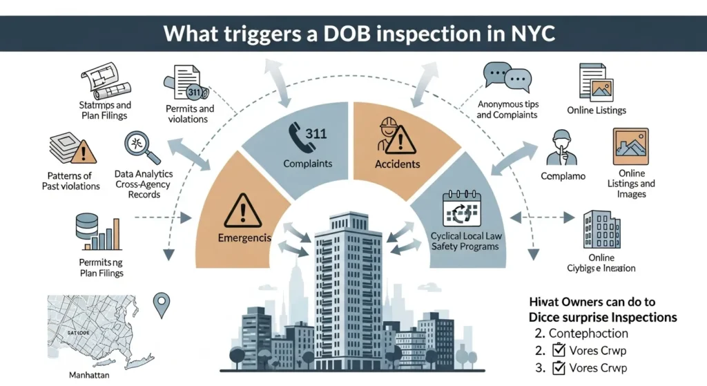 • What triggers a DOB inspection in NYC is usually a mix of visible permit activity, 311 complaints, accidents, and required Local Law safety programs, not random chance.