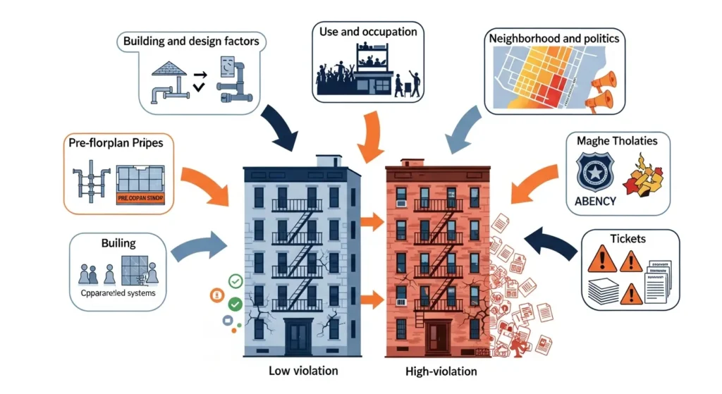 Why does one property end up with a handful of minor items while another nearby has pages of open violations? When we look across empirical studies and NYC enforcement patterns, the same underlying risk factors show up again and again.