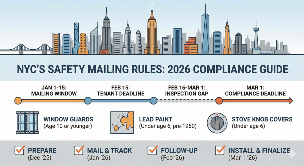 - Send required annual notices to each occupied unit, usually by January 15 for HPD-related notices (like lead and window guards). Exact deadlines can shift slightly year to year, so we always want to check the most current NYC guidance for 2026.